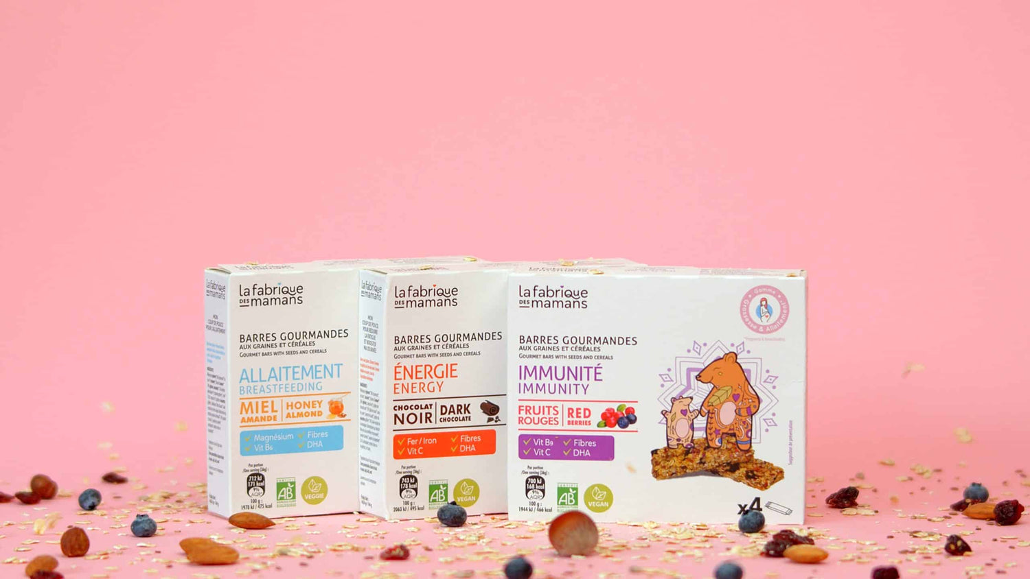 Nos barres énergétiques biologiques sont formulées avec des aliments riches en nutriments : vitamines minéraux, fibres… Pour répondre aux besoins nutritionnels spécifiques des femmes enceintes, nous avons ajouté une l’huile de micro-algue, riche en DHA dont les futures mamans sont généralement carencées pendant leur grossesse. Peu sucrées, saines et nourrissantes, les barres énergétiques accompagnent le fractionnement des repas mais aussi les fringales et les petites envies de douceurs. Le tout dans un format ultra-pratique prêt à l’emploi pour accompagner toutes les futures et jeunes mamans (mais pas que !) dans leurs activités quotidiennes.